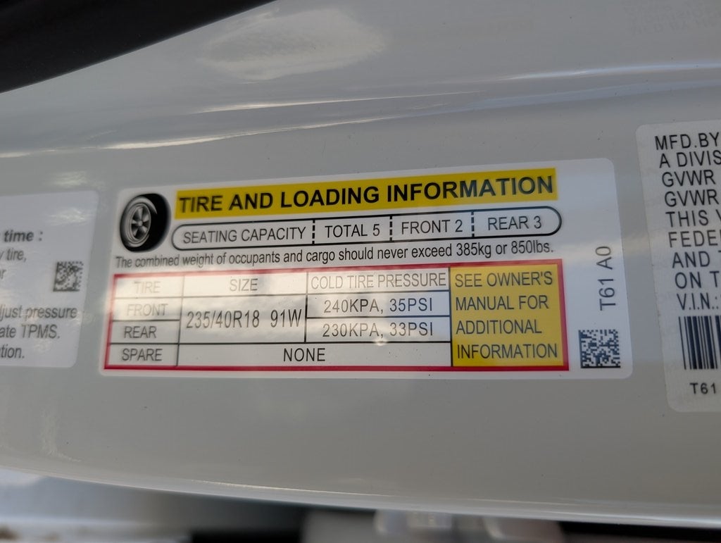 - Tires: 235/40R18 91W All-Season