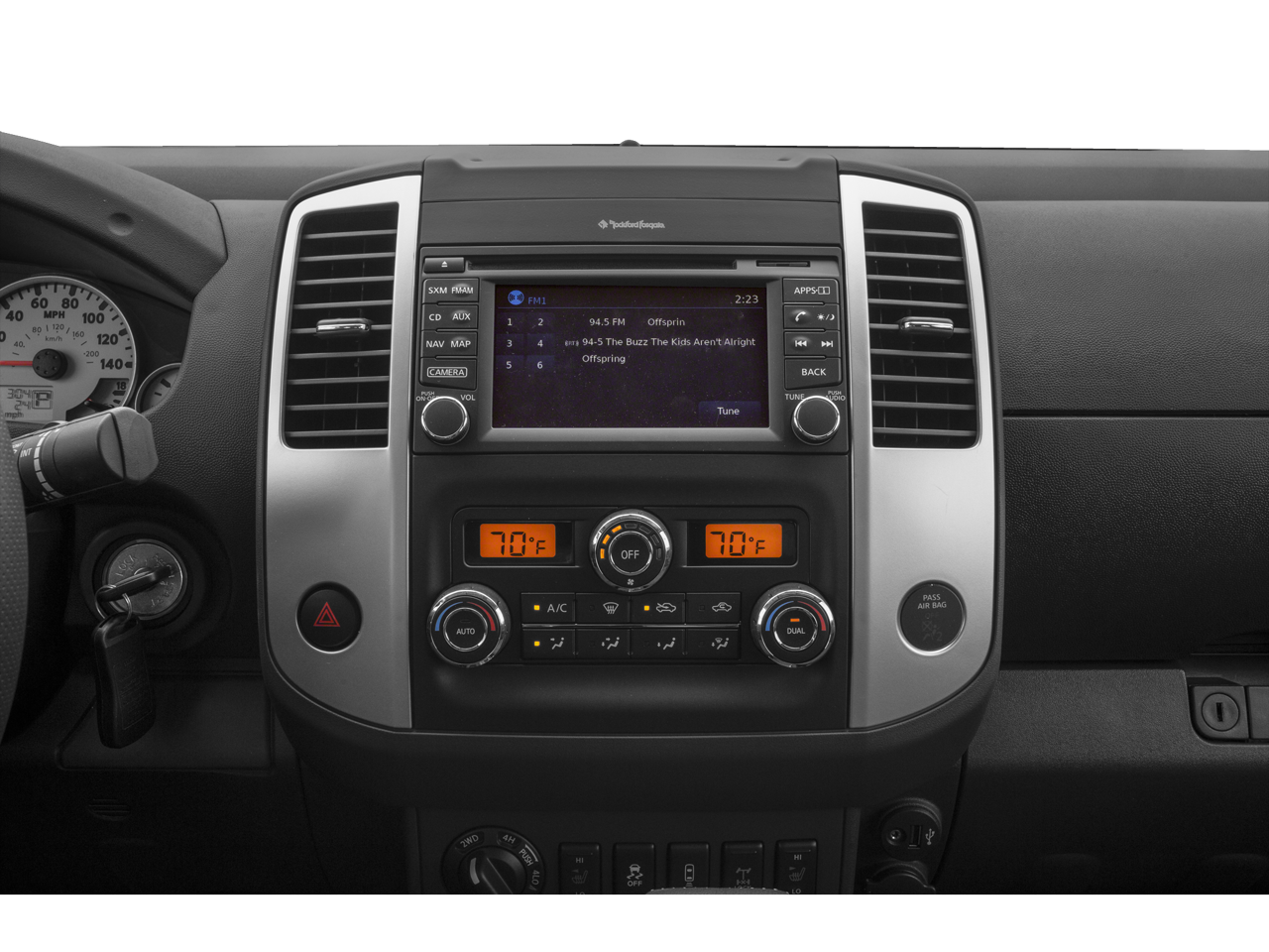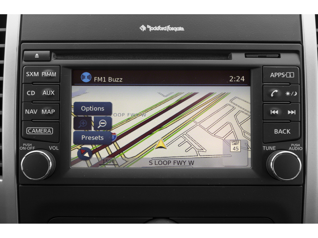 - Radio: Rockford Fosgate Premium Audio System -inc: AM/FM/CD/AUX, 7" color display, USB connection port, Bluetooth® hands-free phone system, streaming audio via Bluetooth®, Siri Eyes Free, steering wheel audio controls, 8 speakers w/1 subwoofer unit (2 speakers), NissanConnect w/navigation and mobile apps, Nissan Navigation System w/voice guidance, 5.8" color touch-screen display, Nissan voice recognition for navigation and audio, SiriusXM Traffic, SiriusXM Travel Link (fuel prices, weather, movie listings, stock info and sports) and SiriusXM satellite radio