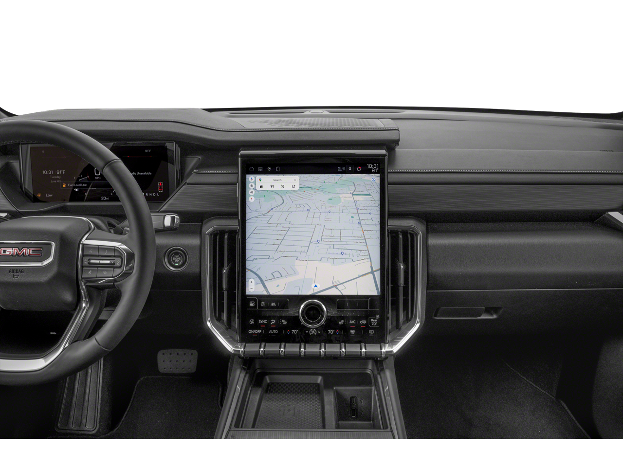 - 15" diagonal Premium GMC Infotainment System with high contrast display, with Google built-in compatibility, including navigation capability, color touch-screen, multi-touch display, connected apps, personalized provides for each driver's settings, Natural Voice Recognition and Phone Integration for Wireless Apple CarPlay/Wireless Android Auto for compatible phones